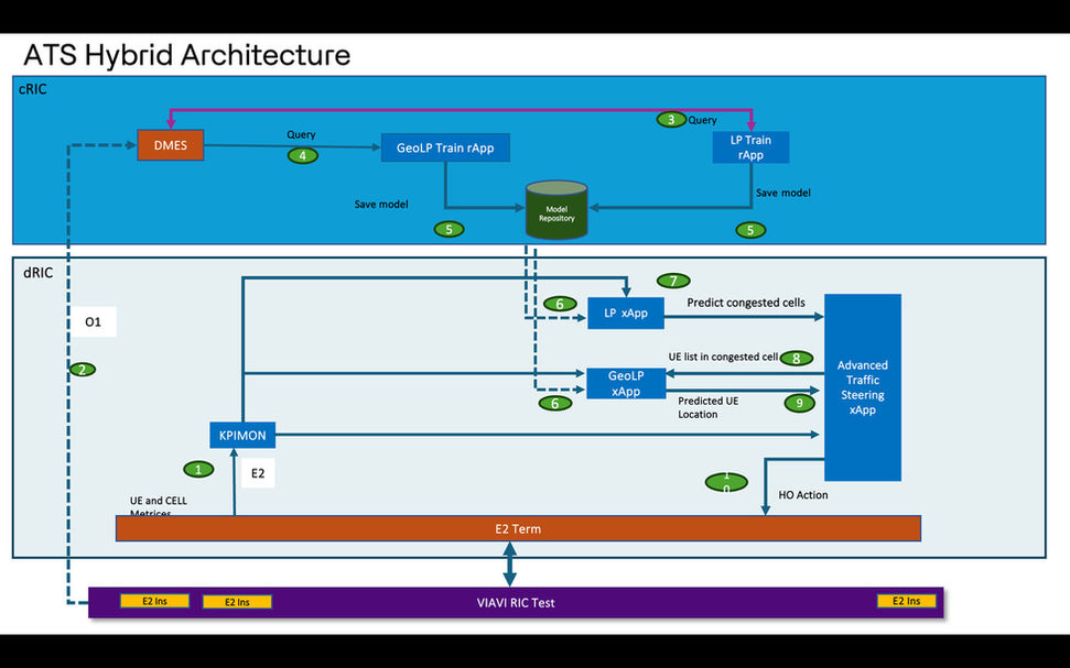 Implementation of RIA use case ?Traffic Steering and Predictive Load Balancing? end-to-end close-loop implementation as hybrid application using O1 for training, pre spec A1 for policy, E2 for training, inference and control. AI/ML based apps are developed to detect cell load prediction and geo location prediction and trigger the handover action.
